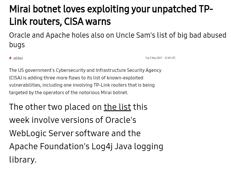 Jeff Burt, Mirai botnet loves exploiting your unpatched TP-Link routers, CISA warns, The Register, https://www.theregister.com/2023/05/02/cisa_exploited_flaws_oracle_apache/